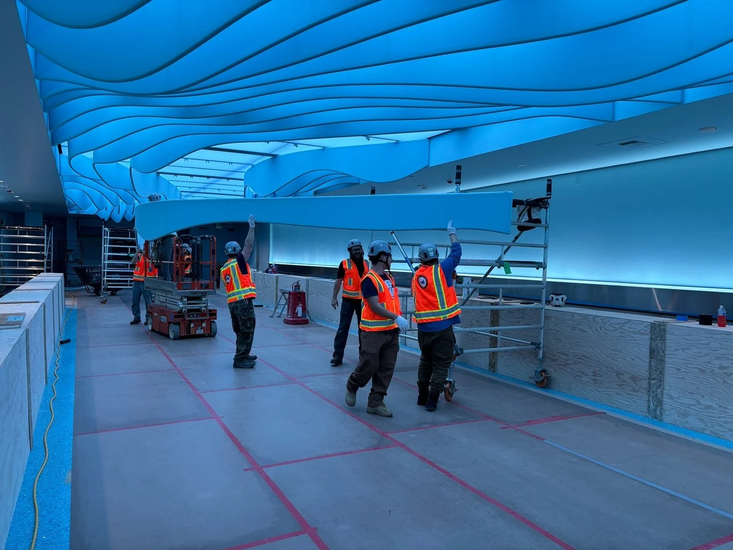 Lighting was challenging since the concept was to be applied to the ceiling rather than the walls. To apply proper lighting to the concept, we couldn’t light from the floor without creating “dead” spots or visual nuisances to passengers. The best option to light the concept was to apply backlighting. The team chose to use light panels to create a false ceiling.